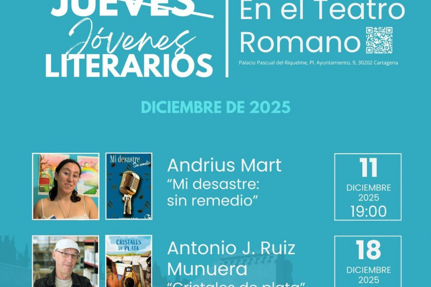 Los autores Andrius Mart y Antonio J. Ruiz Munuera serán los protagonistas de los dos últimos jueves literarios del año 2025, y visitarán el Teatro Romano de Cartagena los días 11 y 18 de diciembre respectivamente.